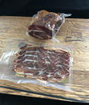 Das Beste vom Hinterteil des Schweines, wird ohne Pökelsalz nur mit Bergkernsalz, Gewürzen und frischem Knoblauch gesurt, und anschließend sanft kalt mit Buchen-Sägespänen geräuchert.