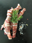 Rehschnitzerl (Keule), Kräutertopfen, Speck, Speisesalz, Pfeffer, Gewürze, Salbei & Rosmarin