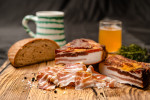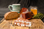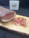 Das Beste vom Hinterteil des Schweines, wird ohne Pökelsalz nur mit Bergkernsalz, Gewürzen und frischem Knoblauch gesurt, und anschließend sanft kalt mit Buchen-Sägespänen geräuchert.